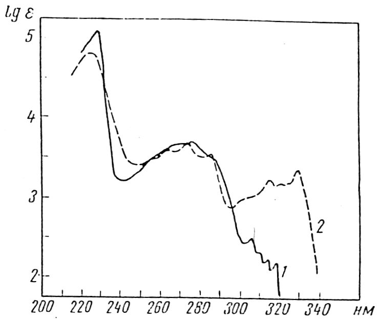 Объясните разницу в спектрах поглощения 2-нафтилкарбинола (кривая 1) и β-нафтола (кривая 2):